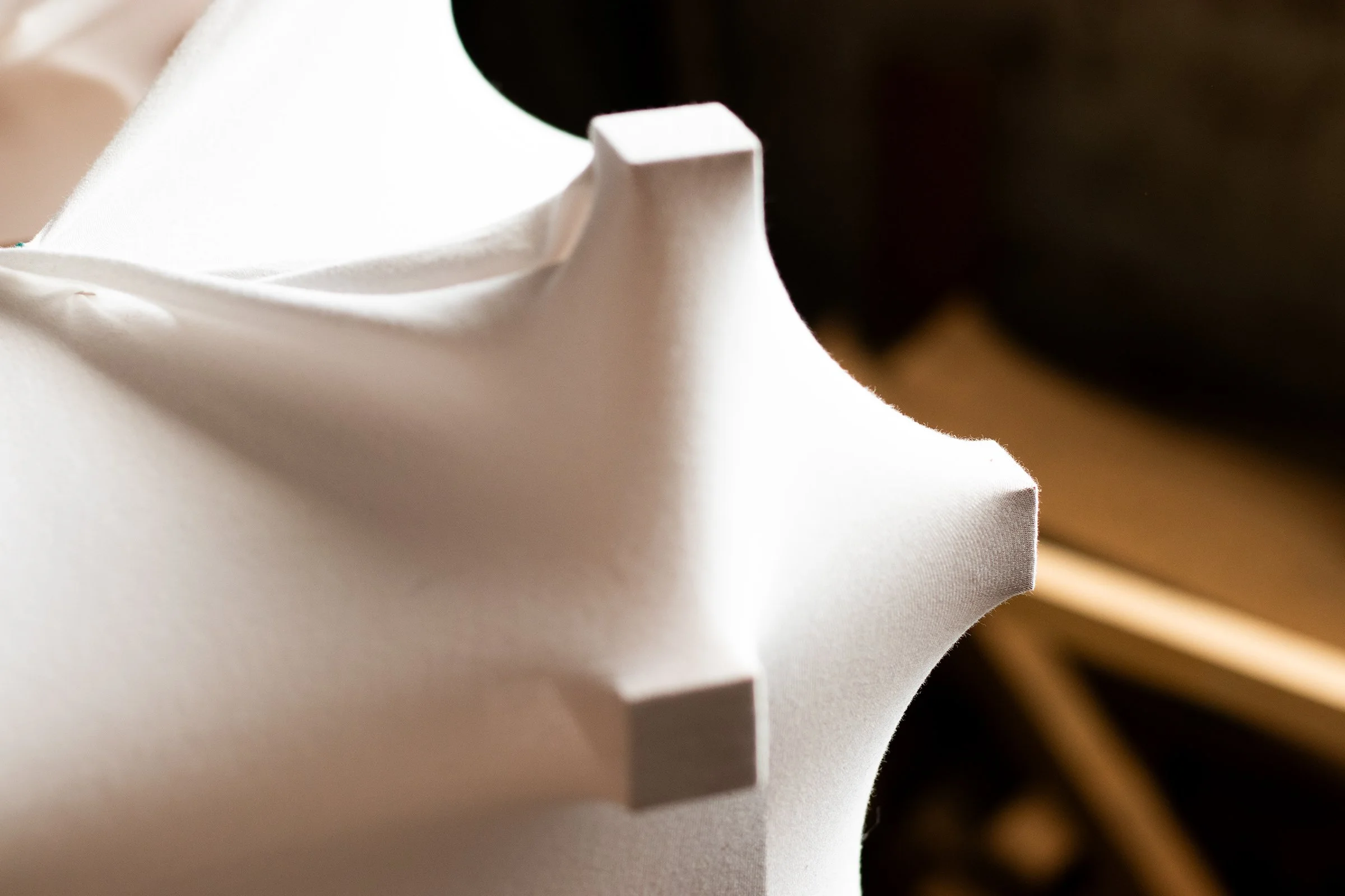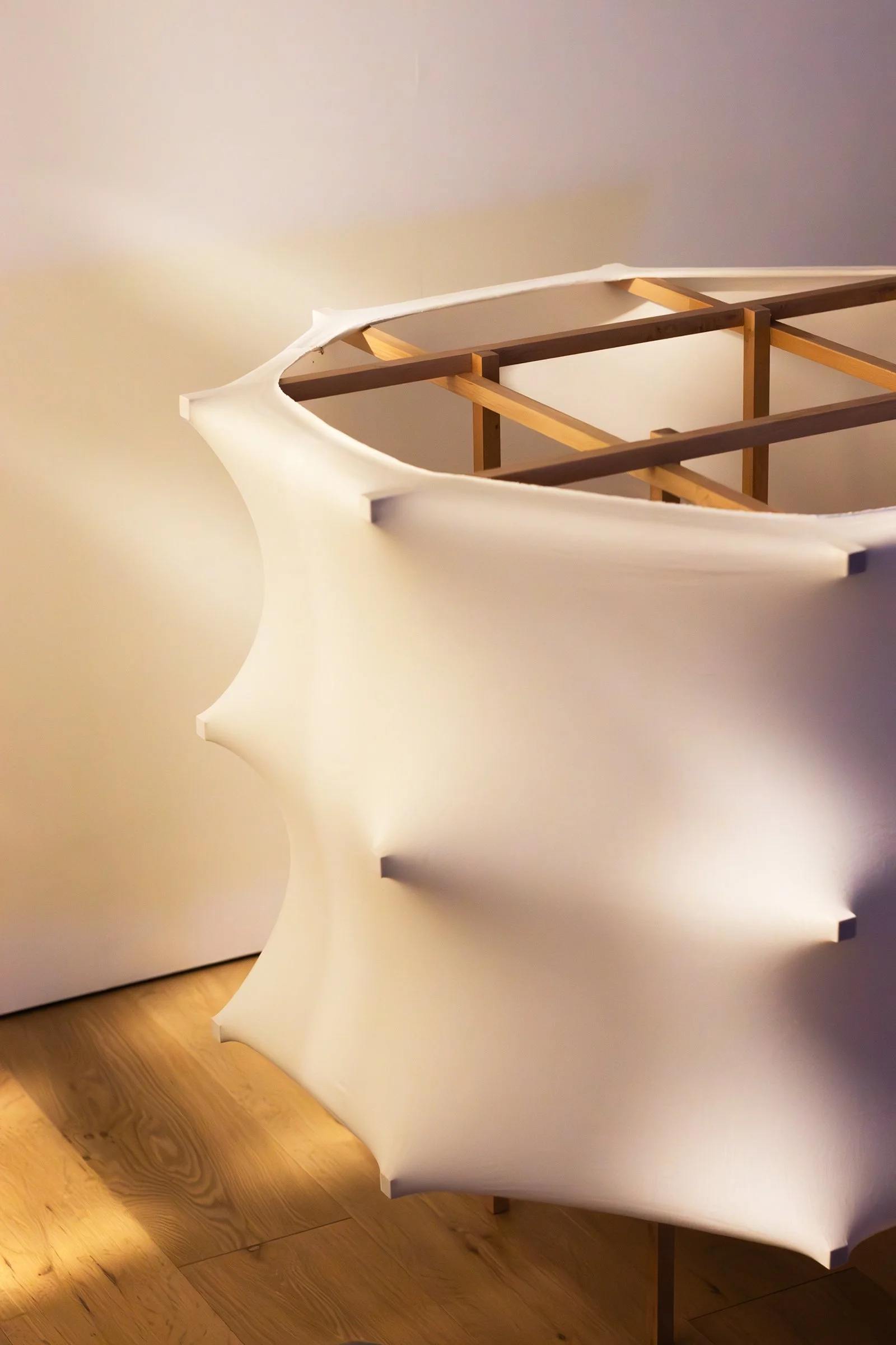 The addition of the fabric was a bit of a shock at first. The material itself came from a fairly standard local supplier, chosen because it was deemed stretchy enough, but also because it had a warm white colour that differed from the other options, which were much more blue-white.