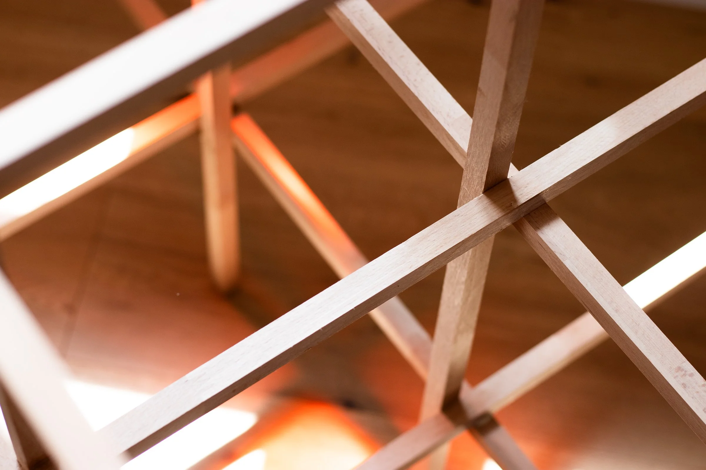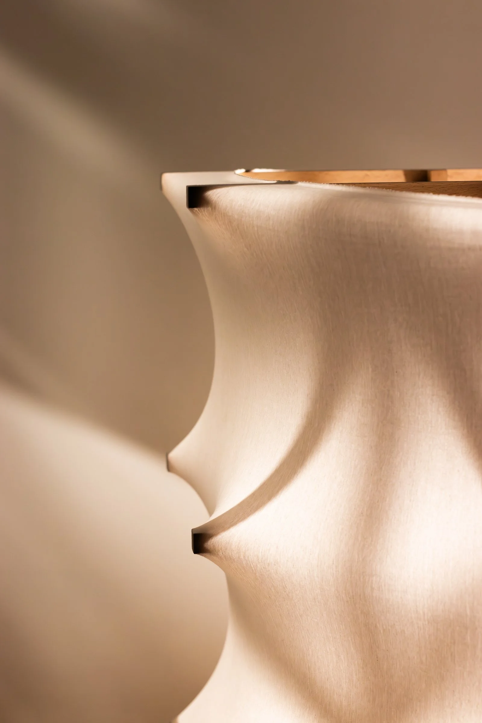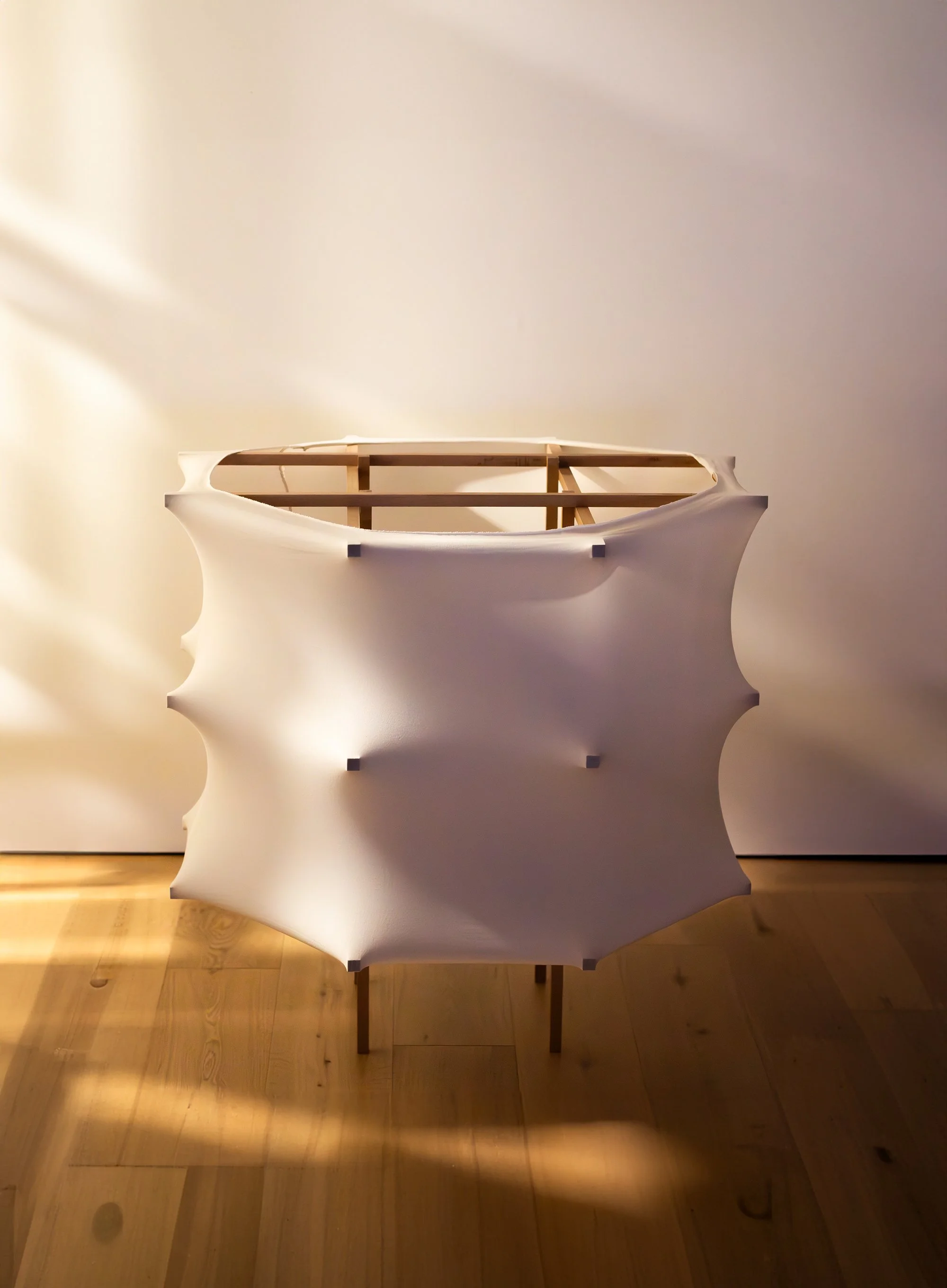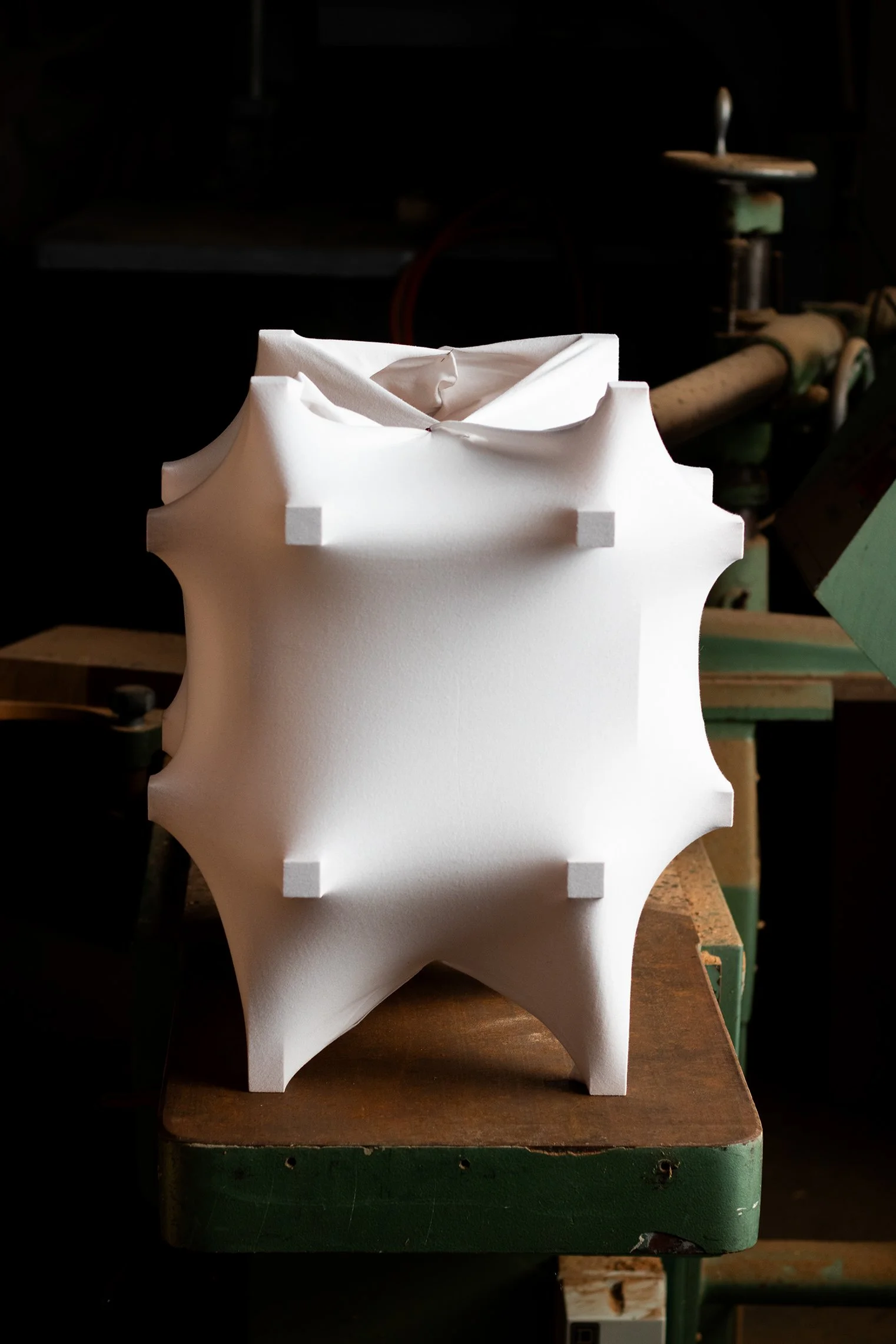 Once the material was loosely stretched over the frame with a light source inside, it began to give up some of its opacity and shift toward a subtle transparency. Not in a linear fashion, mind you. It seems to be very much dependent on the amount of tension in the fibres and the shapes it’s forced into. Additionally, the way light plays across the warm white exterior is particularly interesting. Together, this creates a mix of shadow cast from within the structure and highlights on the exterior surface. The square protrusions of the inner frame add additional drama. The end result is something even a very skilled CAD sculptor would take a long time to develop on a computer.